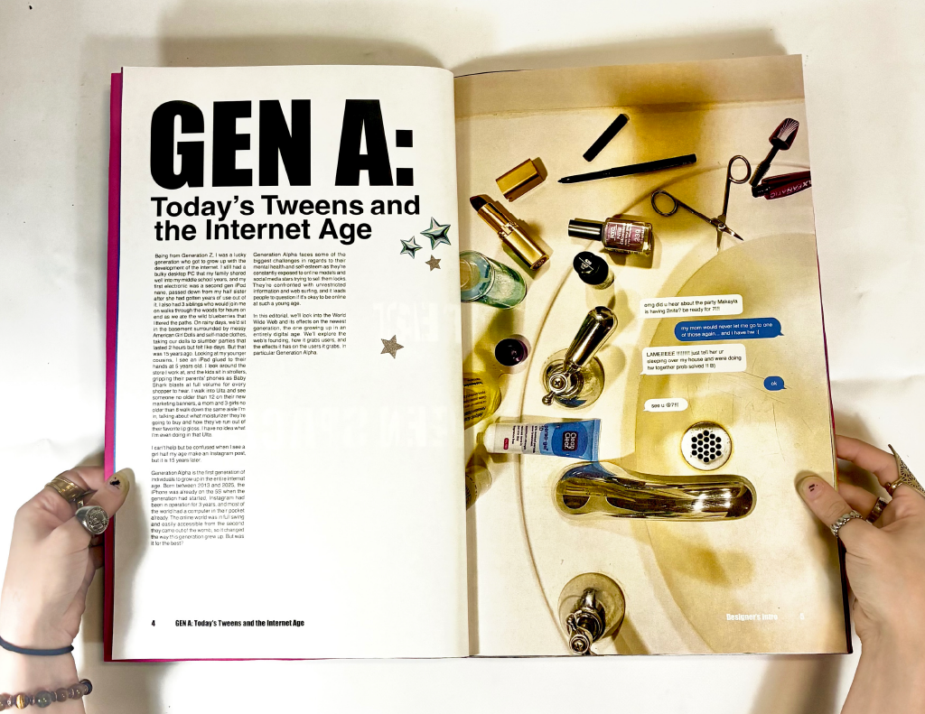 Gen A: Today’s Tweens and the Internet Age is an editorial that covers what it is like to be a tween in todays world. It covers new wave slang like “skibidi” and “rizz”, how these tweens are reacting to the real world in comparison to older generations, and it also explores the need for a space that these kids can naturally grow up in.